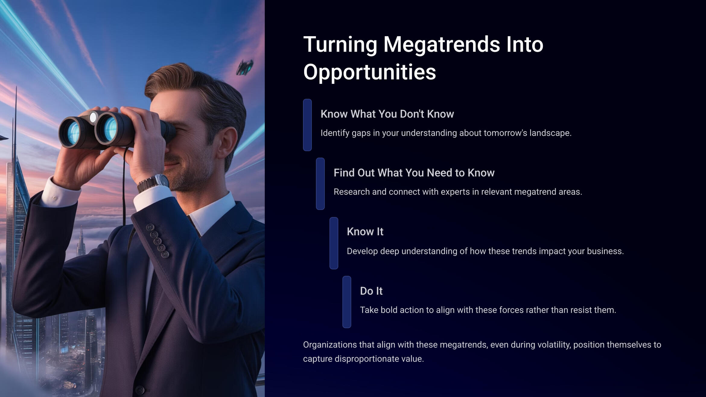 Organizations that align with these megatrends, even during volatility, position themselves to capture disproportionate value.