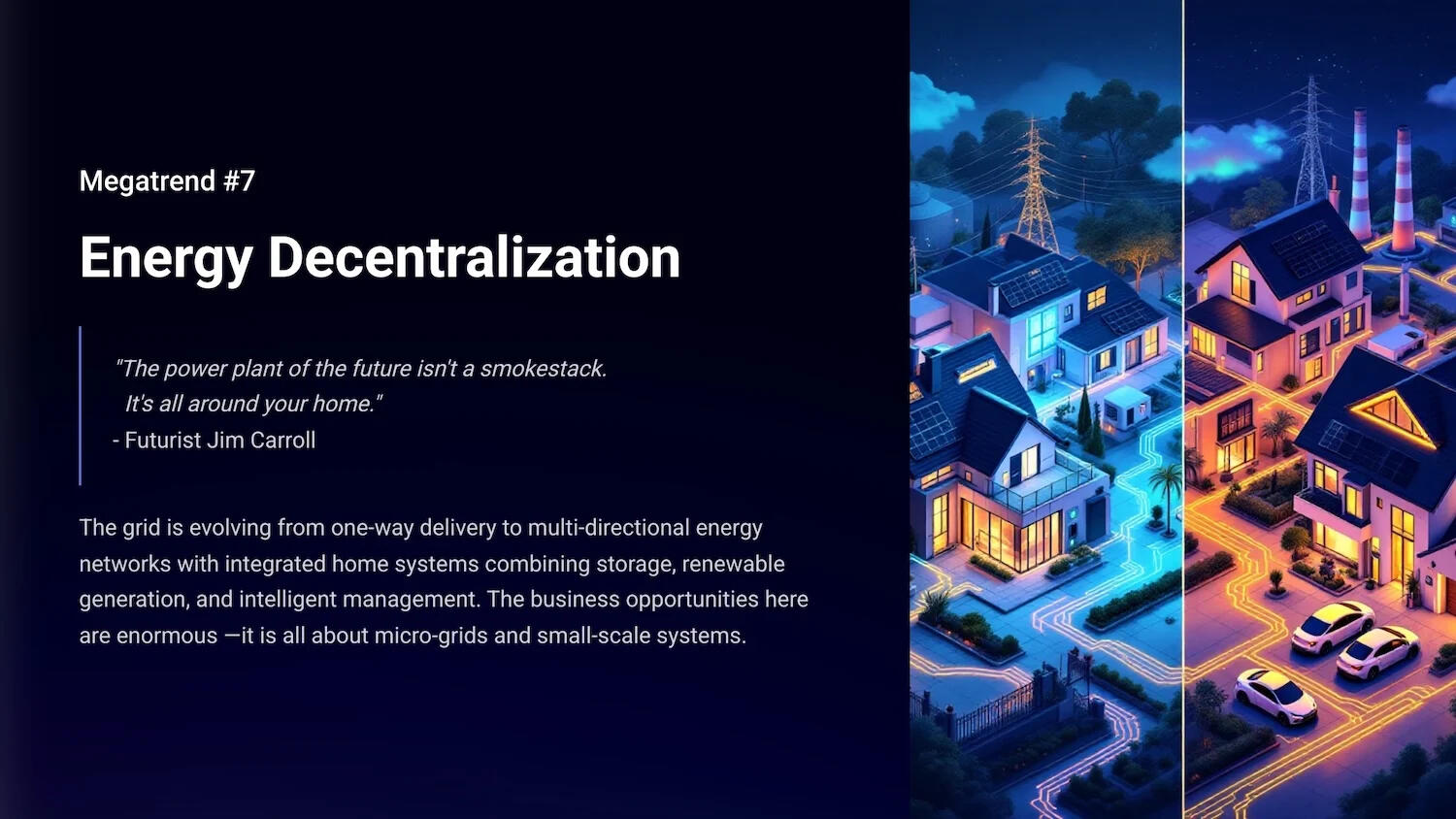 It's a massive shift from carbon to electric power, transforming transportation. It includes “energy decentralization” with multi-directional networks and “climate-positive technologies” that improve the environment while creating economic value.